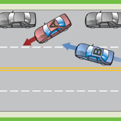 In the diagram, Vehicle B is changing lanes on the roadway. As Vehicle A exits the parking spot onto that roadway, Vehicle B and Vehicle A collide.