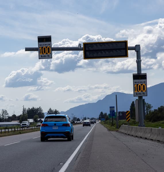 Pictured: In 2020, we partnered with the B.C. government to install a variable speed limit system along Highway 1 in Chilliwack.  The displayed speed limit is lower in bad weather conditions, like ice and fog.